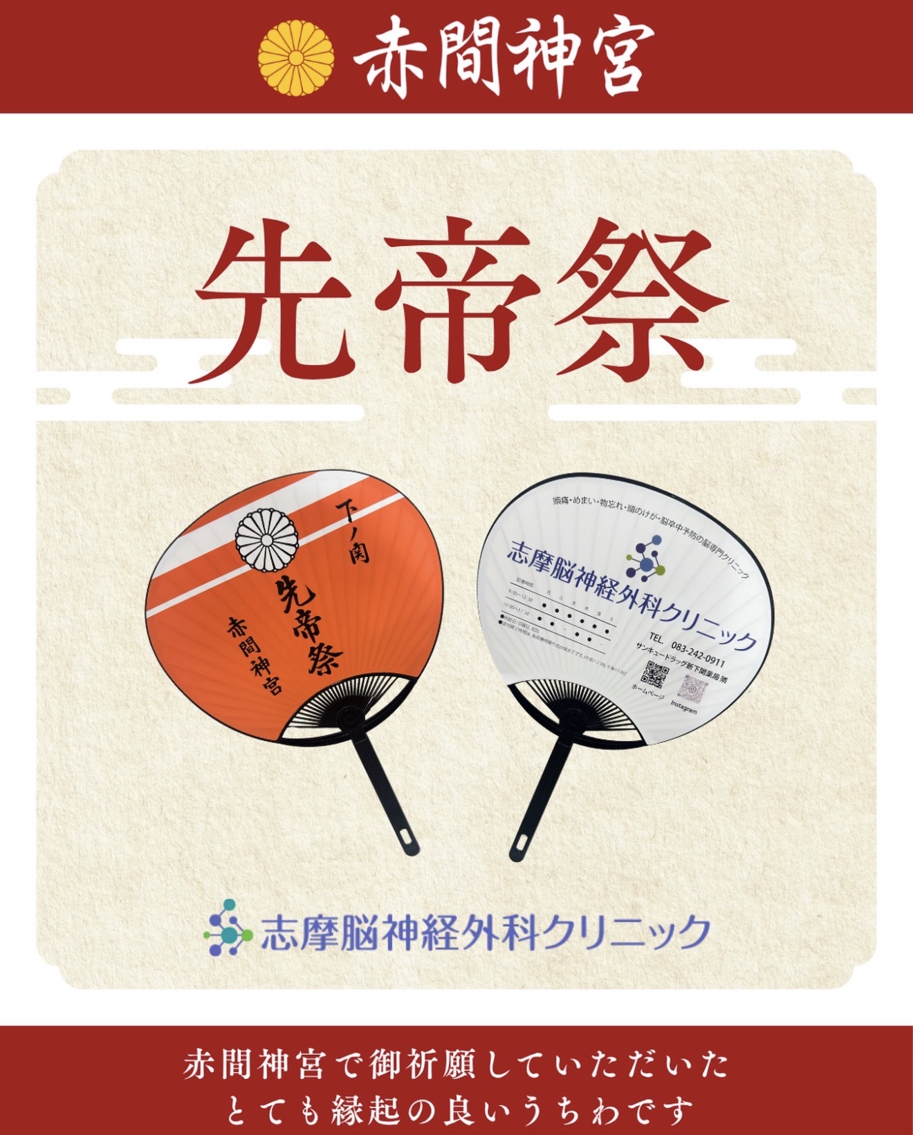 裏面に当クリニックのロゴが入った先帝祭の「うちわ」がお祭りで配られる予定です。