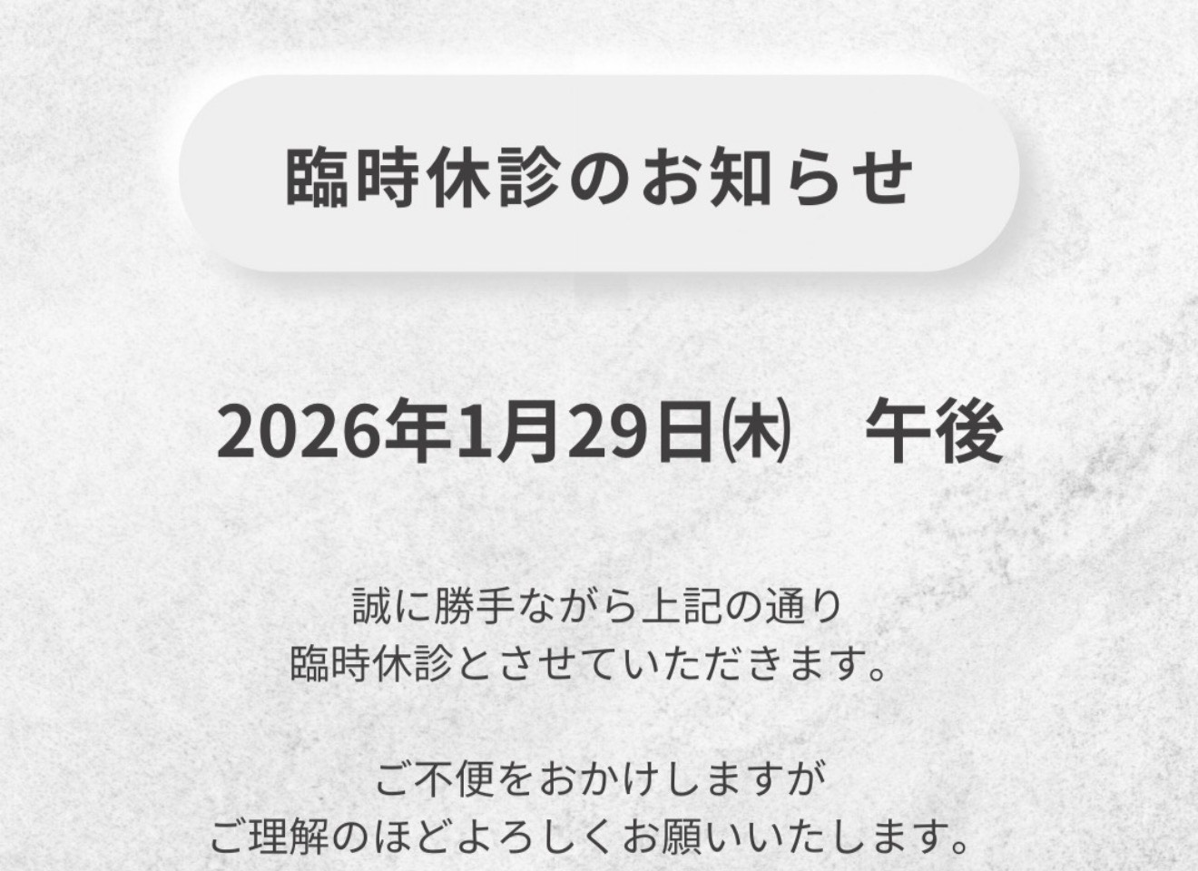 木曜午後は本来診療時間になるのですが、2026/1/29(木)は午前中診療のみになります